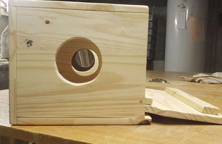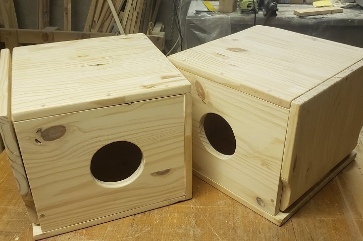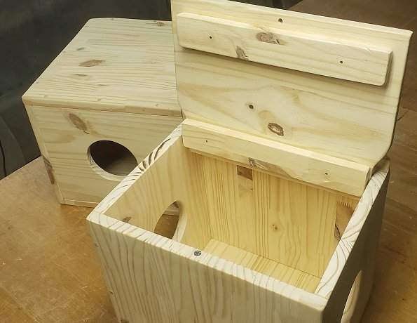 Nous avons adapté un chalet de la gamme « kit-chat » en y ajoutant une pellicule de papier bulles pour la chaleur et l’étanchéité, lui-même recouvert d’une deuxième couche de bois d’extérieur.