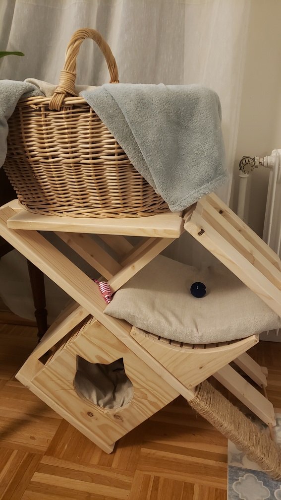 🐾 Espaces de jeu intégrés : un passage intérieur ludique du premier au deuxième niveau garnit de liège, un perchoir en troisième niveau où vous pourrez y déposer un coussin ainsi que des cordes pour stimuler son instinct joueur.
